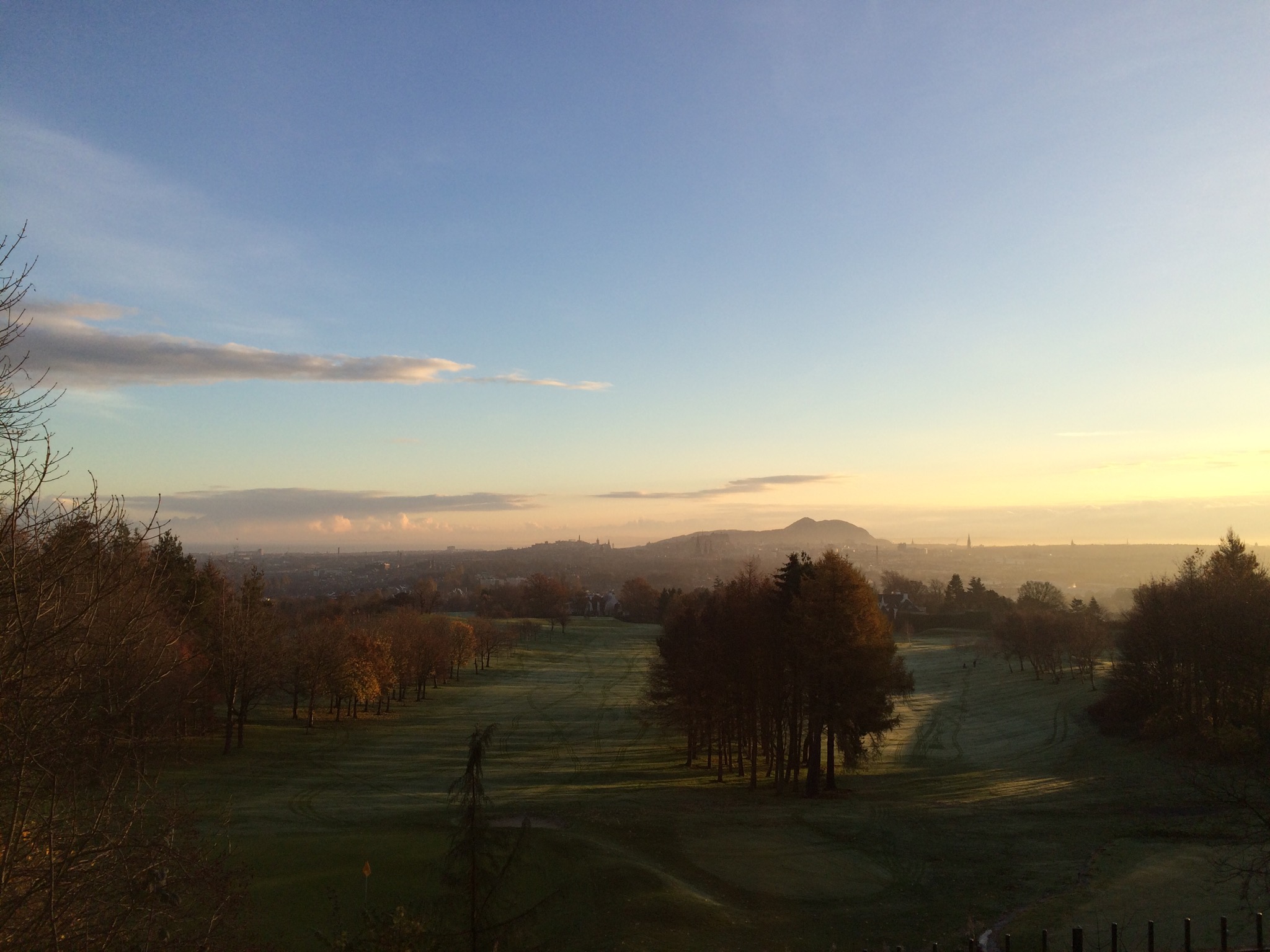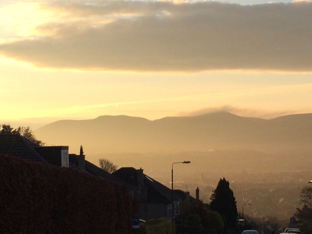 Again I exit the estate into a main road, this time no traffic lights yet a lollipop lady is holding traffic for the school run is crossing. I make use of this and jolt across the road and now I’m into a climb. The road steeply rises, the path narrow made impossible to pass by with cars parked half on and half off. I choose the road. The breath is clouding the air around me, I’m huffing and puffing like a steam train straining at the gradient. I glance to the right, where a road disappears downhill opening up a vista across the valley toward the Pentland Hills. The sun is just behind the curtain, the view is a hue of warmth.