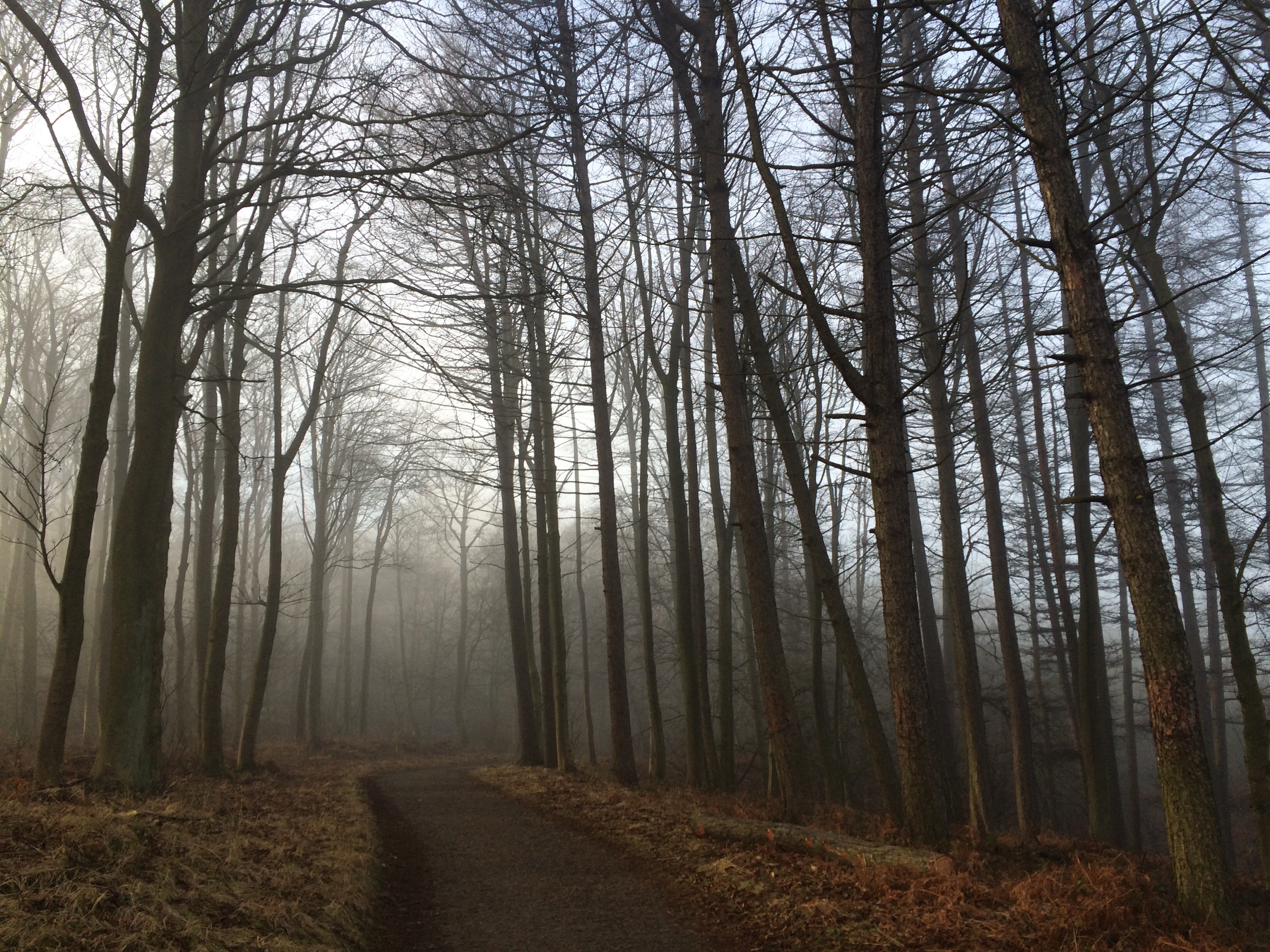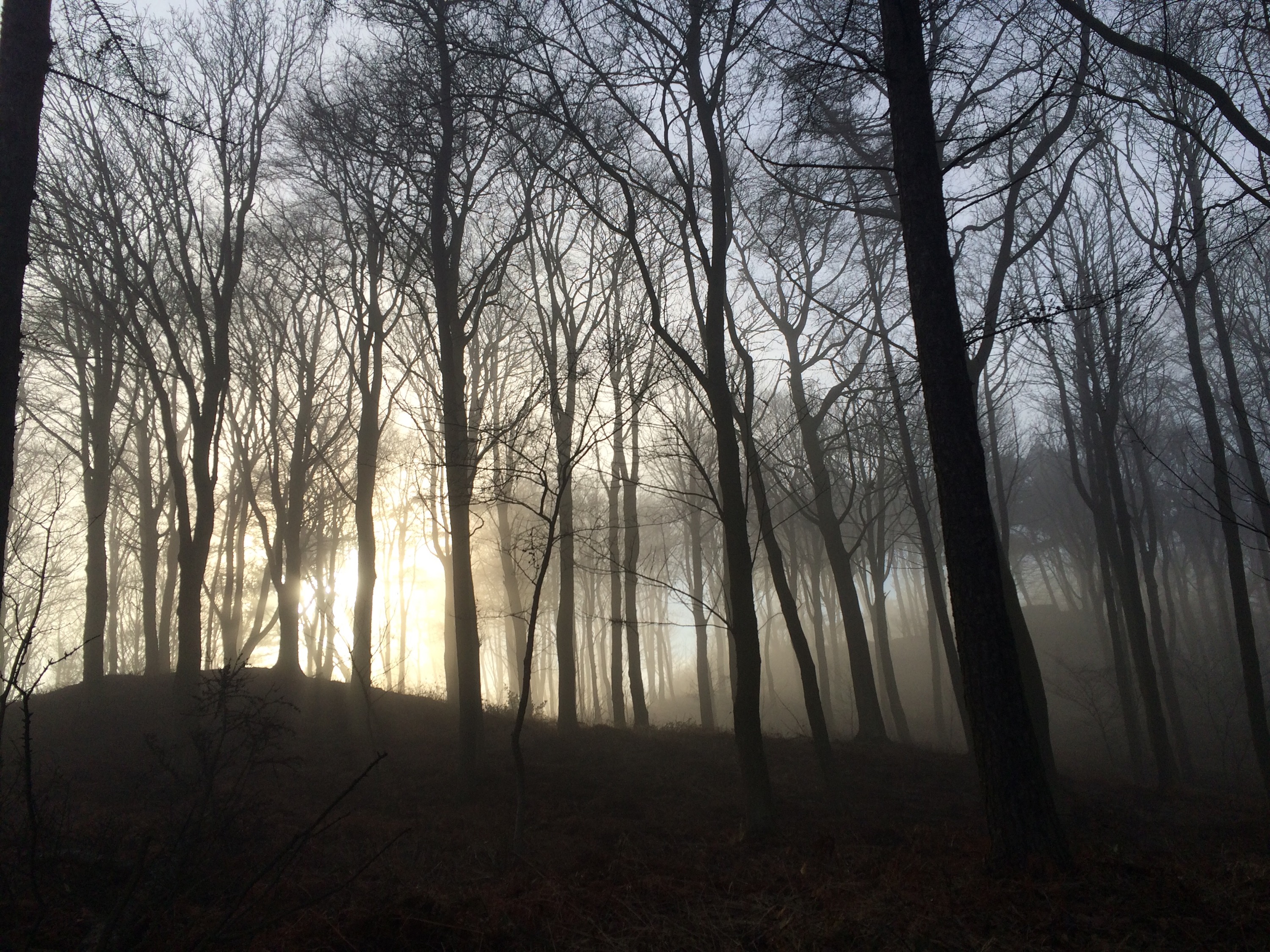 Eventually the haar started to engulf me. There was a eerie silence as the mist muffled the air. The sun slowly disappearing behind a wall of thick moisture. There were rain drops falling though made by the water condensing on the trees and forming large droplets sporadically dropping unevenly, heavily on the wooded floor.