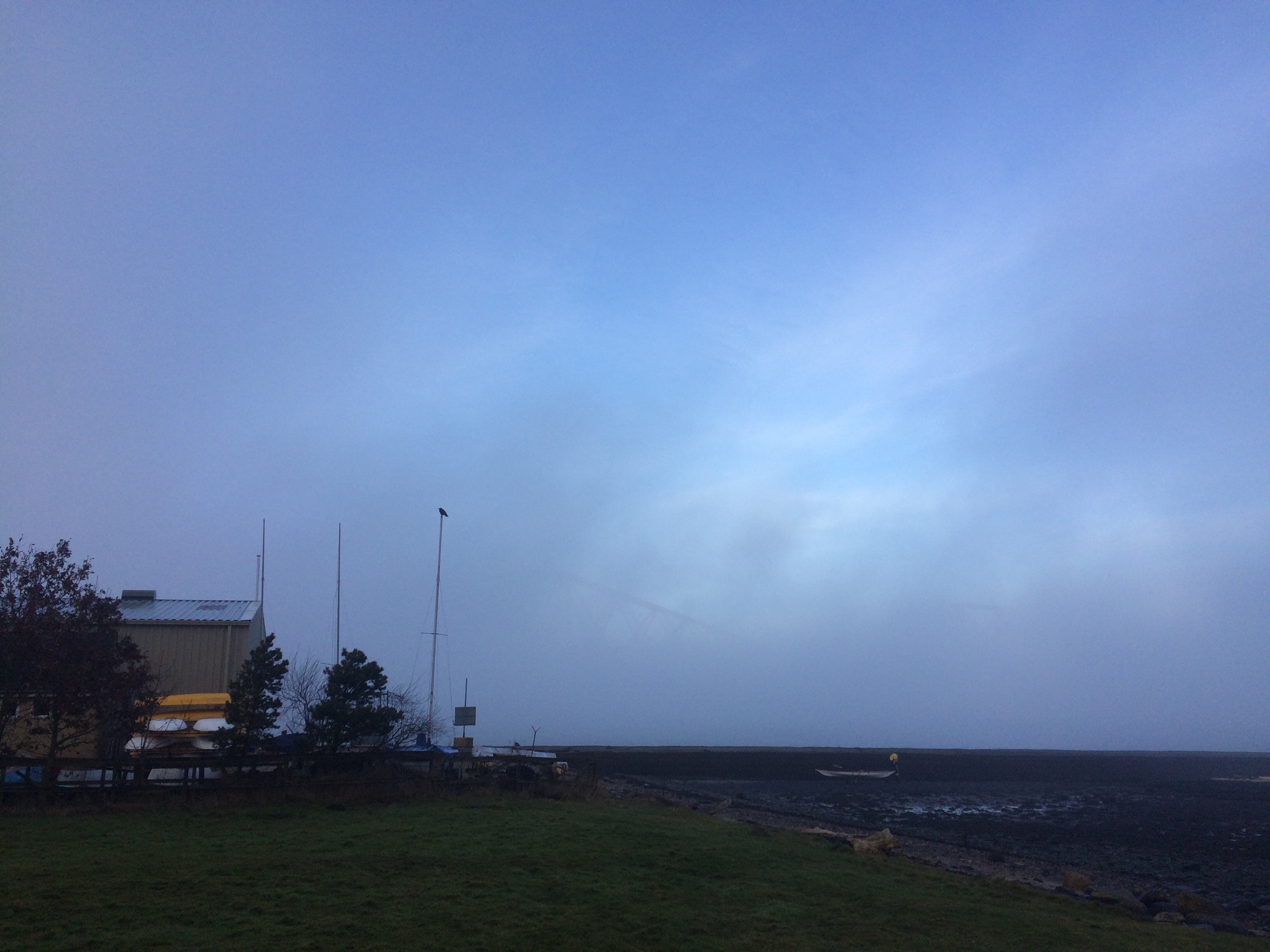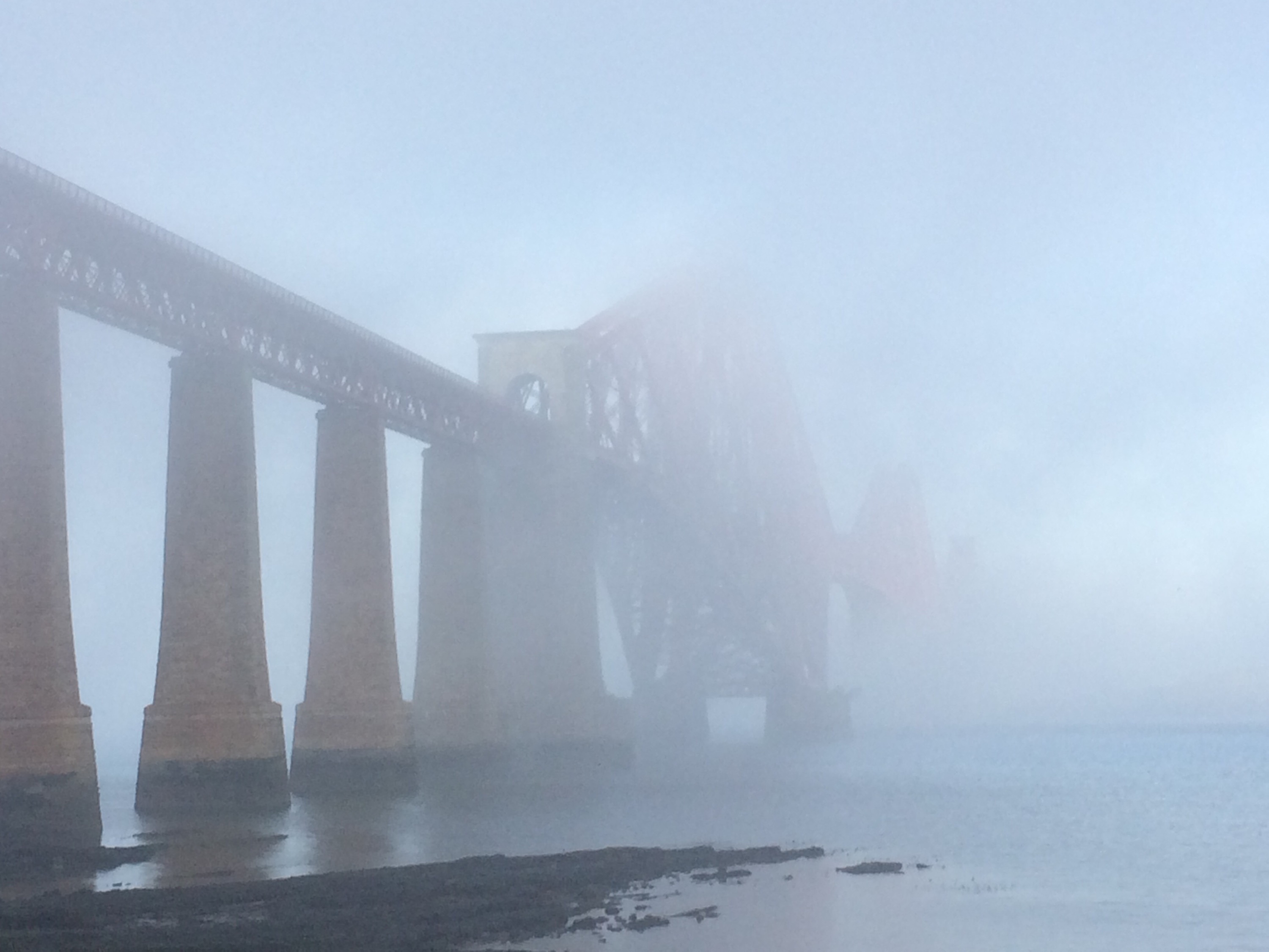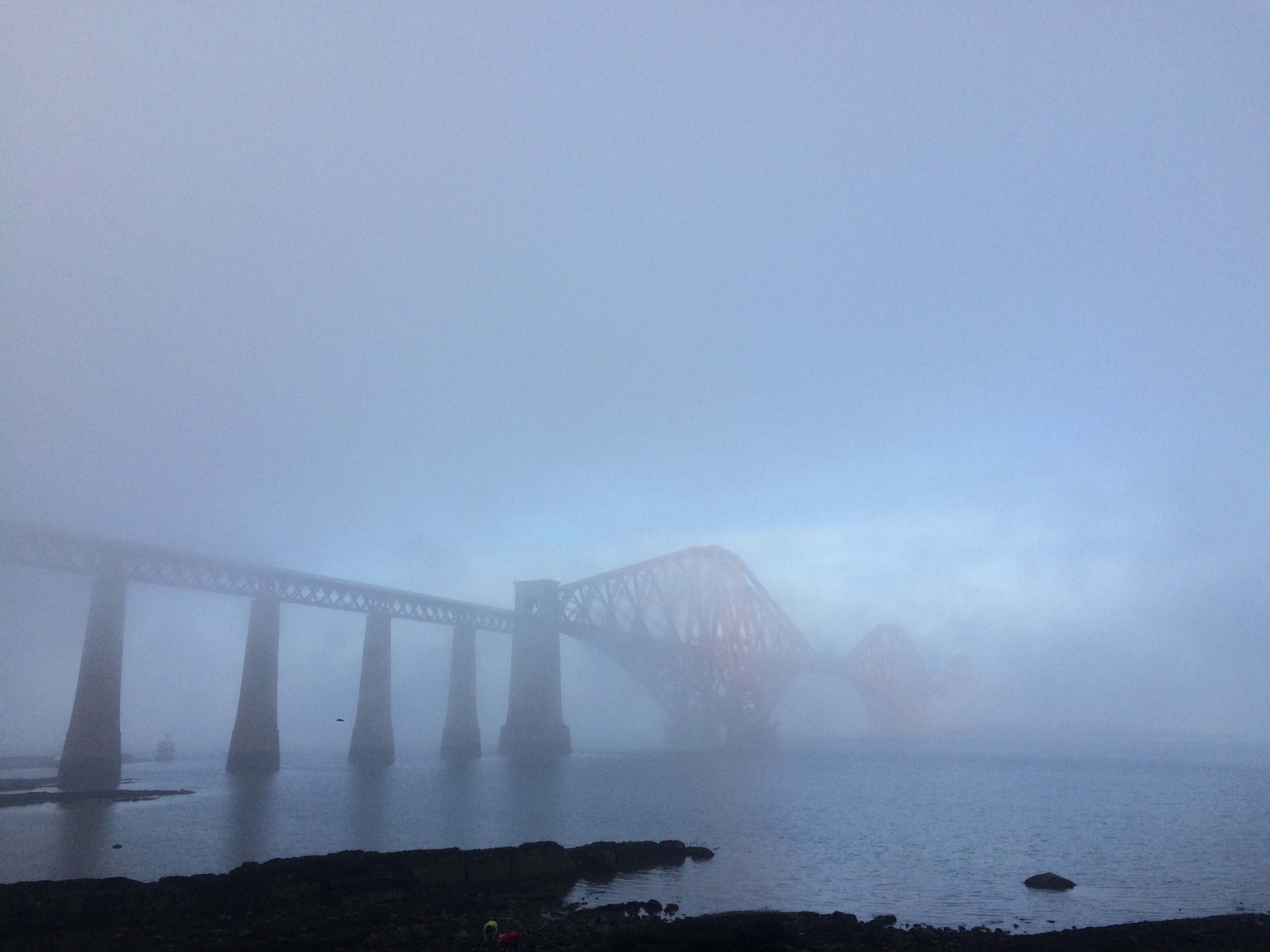 The wood opens up as the path takes to the shore. Usually I’m presented by one of the wonders of the Industrial Age, the Forth Bridge. The fantastically sturdy rail bridge. I stood in awe and realised periodically the mist would clear and show parts of the bridge