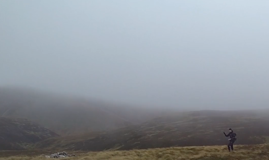 We headed up and into the cloud. The ground was saturated, the moss and heather swimming in icy rain water, my shoes were wet to the core and feet were going numb. We located the next control at the top of a reentrant, a river was flowing down hill and the control was in the middle of it. I sent Nina into it as she had the dibber! I set out to locate the next control. 40 points in the bag.