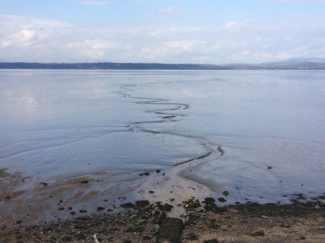 The view now was of the Forth valley, Fife in the distance and industry on the shore line. The path entered a forest, the soft floor made running bouncy. The run exited at a historic site where James Watt built something. I forget what but probably something to do with Electricity. The JMW runs down the long driveway with an impressive gateway and tree lined. I was now in Bo’ness where I’d been before but on my bike. It was toward the end of a Round the Forth route, 120km ride and I was tired. I just remember wanting to get off my bike and struggling up this massive hill that I was now running down. Freely, fast and what seemed effortless I entered a park heading toward the coast. The JMW so far finding off road paths. I crossed the Bo’ness railway line which has steam trains run back and forth. I didn’t see any today and the track was free. The path was Tarmac from here, following the Forth. The tide was out exposing mudflats and that smell of salt and decaying vegetation.