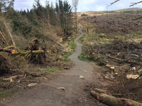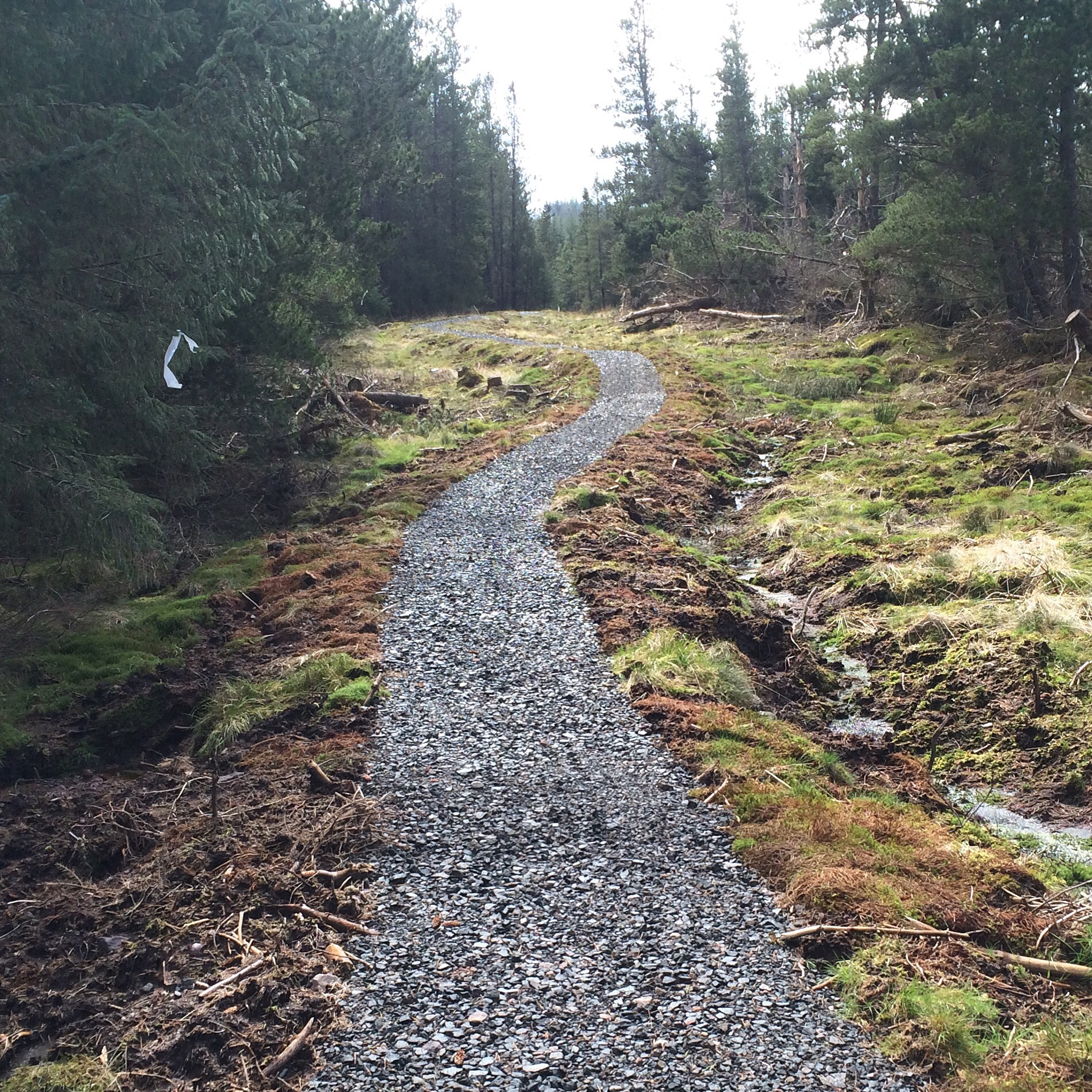 The next day we left in rain heading along the shore and through Balloch castle grounds. The B roads that followed were windy and boring but soon we would enter the forest section. Easily signed the route took a nice southerly direction, turning around the views of the Ben were still there. The forest is on top of a hill and the new path glistened in the sun, freshly dampened by a hail shower.