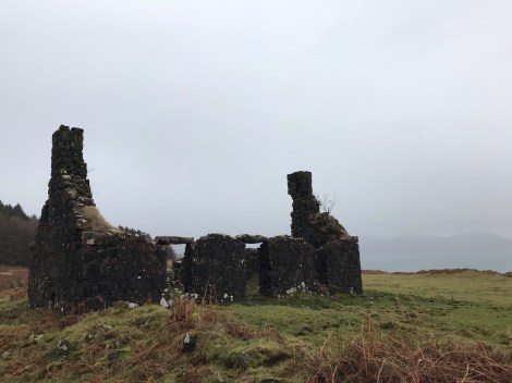 The plantation ended at a deer fence, I passed through the broken gate which had been leant against the post as best it could be and came out into heather. Now I was on top of a hill looking out to the land that dropped away eventually to the cliffs. In the near distance an old Croft stood dark and proud. Two chimneys remained but no roof. I ran through the dead bracken to get there. The wind wild was making the place feel even more eerie. I’m fascinated by the ruins. Who lived here and what was it like? I’d imagine where they’d get fresh water, where they’d keep their animals and where they’d fish. The walk back into Tobermory would have been long and arduous and they wouldn’t have any electricity.