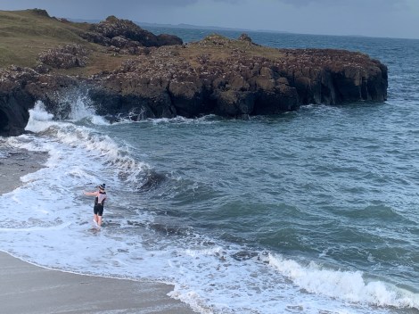 However on the west side the high rocks had disguised a bay that after a little exploration we found. The rocks on either side were about 2m high but made a wee bay. The sand steeply dropped down to the sea. The swell was high with waves coming in fast and strong and withdrawing equally fast and strong. I found a rock on the west side, sheltered from the wind and undressed. Tentatively walking toward the sea, broken shells under feet, sand cool and wet.
